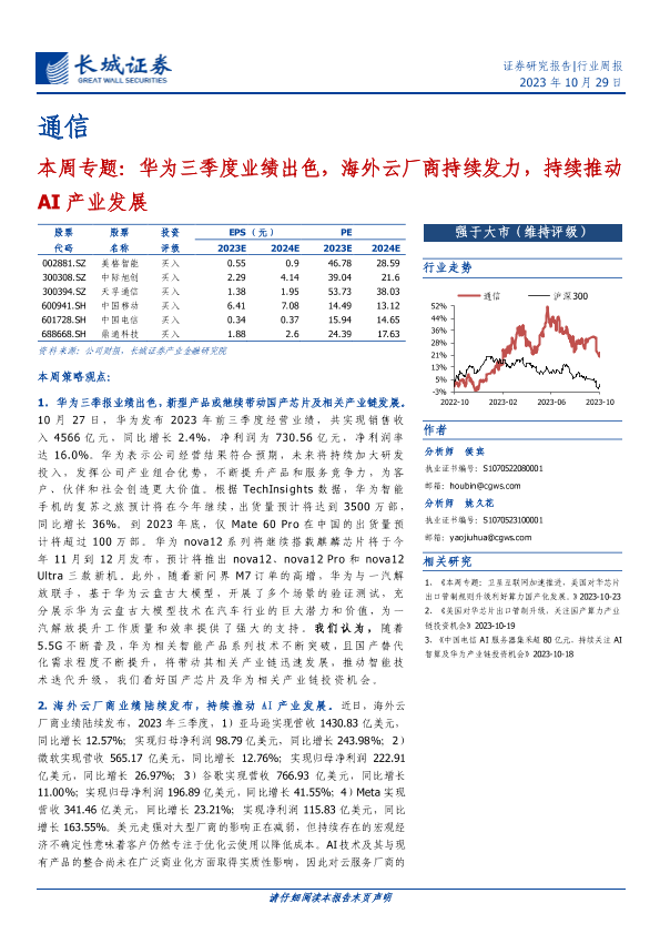 【长城证券】【20231029】通信本周专题:华为三季度业绩出色,海外云厂商持续发力,持续推动AI产业发展-24页