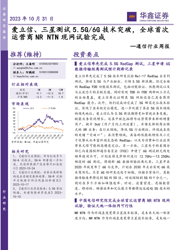 【华鑫证券】【20231031】通信行业周报:爱立信、三星测试5.5G 6G技术突破,全球首次运营商NR NTN现网试验完成-30页