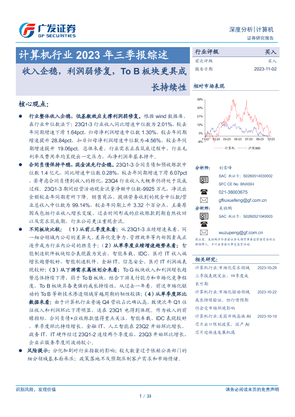 【广发证券】【20231102】计算机行业2023年三季报综述:收入企稳,利润弱修复,To B板块更具成长持续性-33页