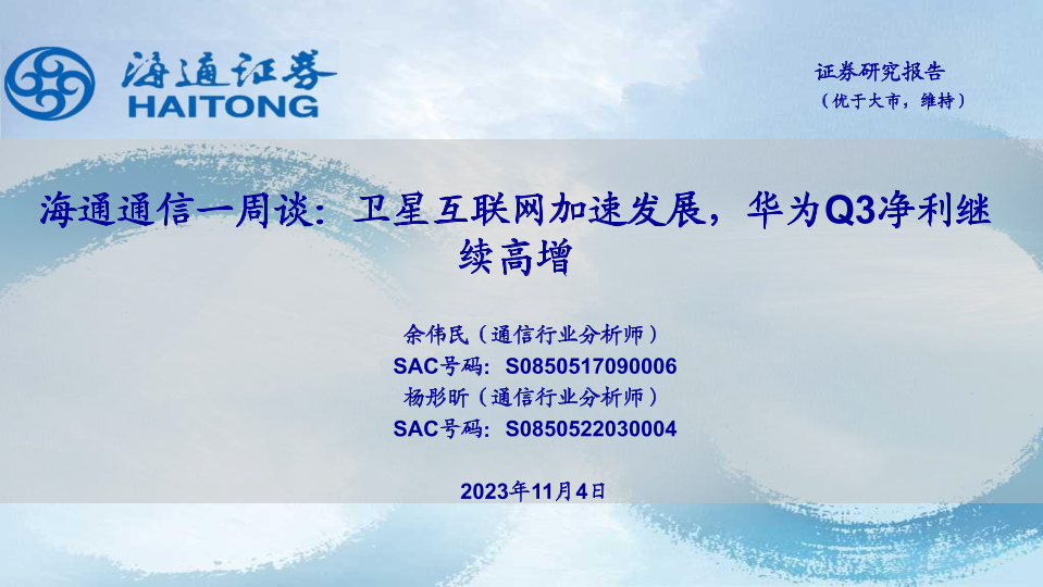 【海通证券】【20231104】海通通信一周谈:卫星互联网加速发展,华为Q3净利继续高增-14页