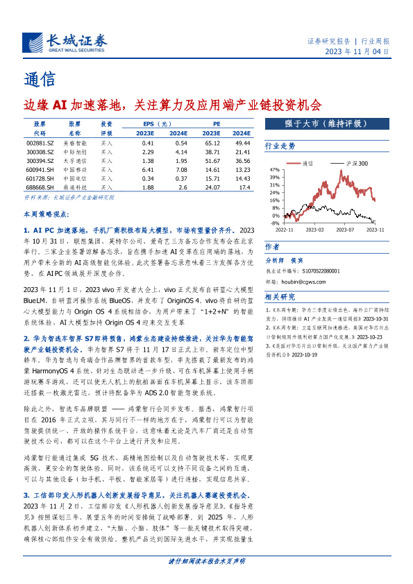 【长城证券】【20231104】通信行业周报:边缘AI加速落地,关注算力及应用端产业链投资机会-17页
