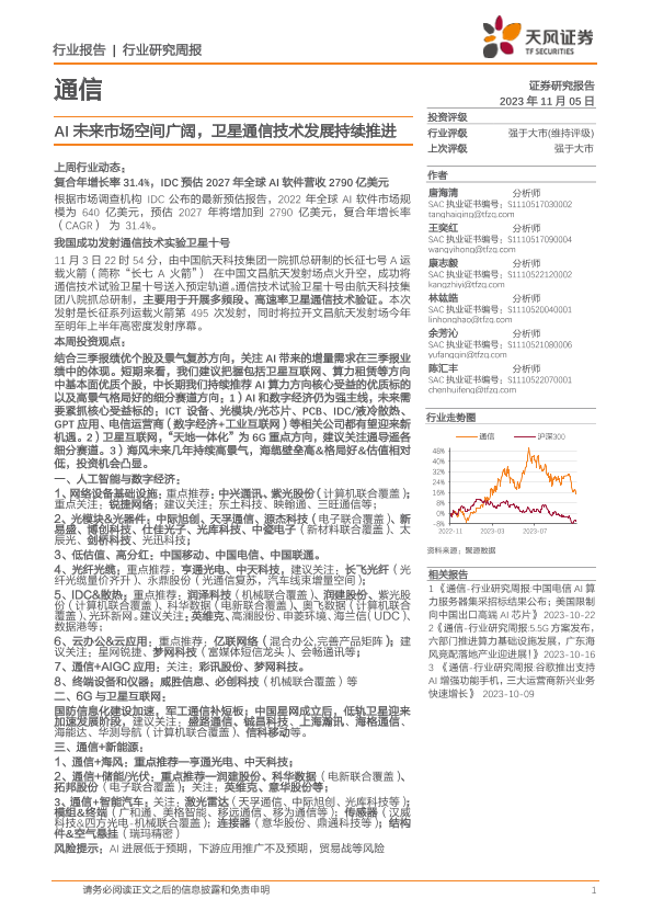 【天风证券】【20231105】20231105-天风证券-通信行业研究周报:AI未来市场空间广阔,卫星通信技术发展持续推进-10页