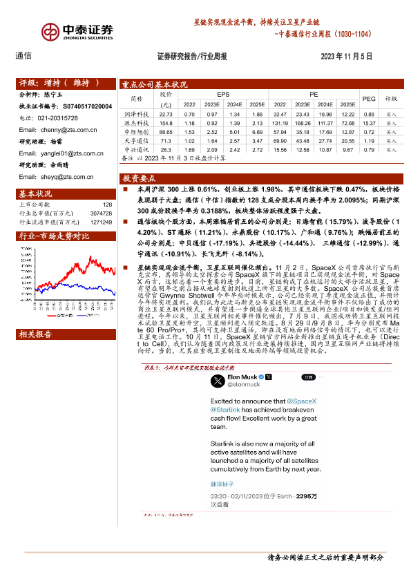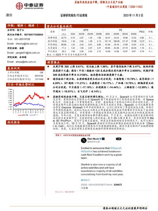 【中泰证券】【20231105】中泰通信行业周报:星链实现现金流平衡,持续关注卫星产业链-14页