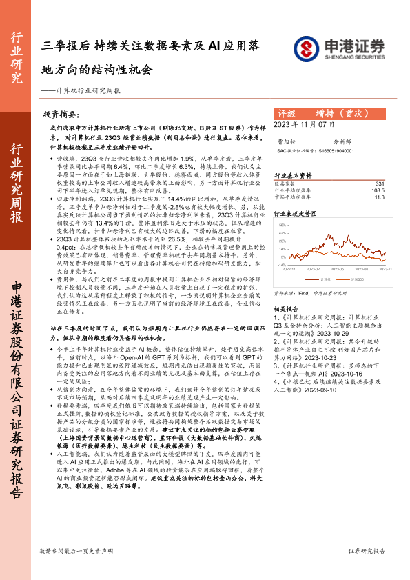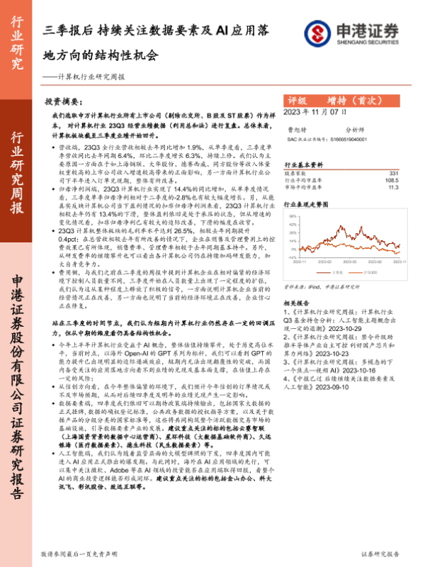 【申港证券】【20231107】20231107-申港证券-计算机行业研究周报:三季报后持续关注数据要素及AI应用落地方向的结构性机会-10页
