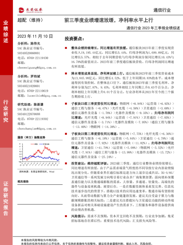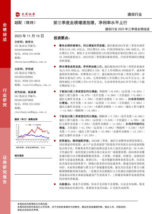【东莞证券】【20231110】通信行业2023年三季报业绩综述:前三季度业绩增速放缓,净利率水平上行-32页
