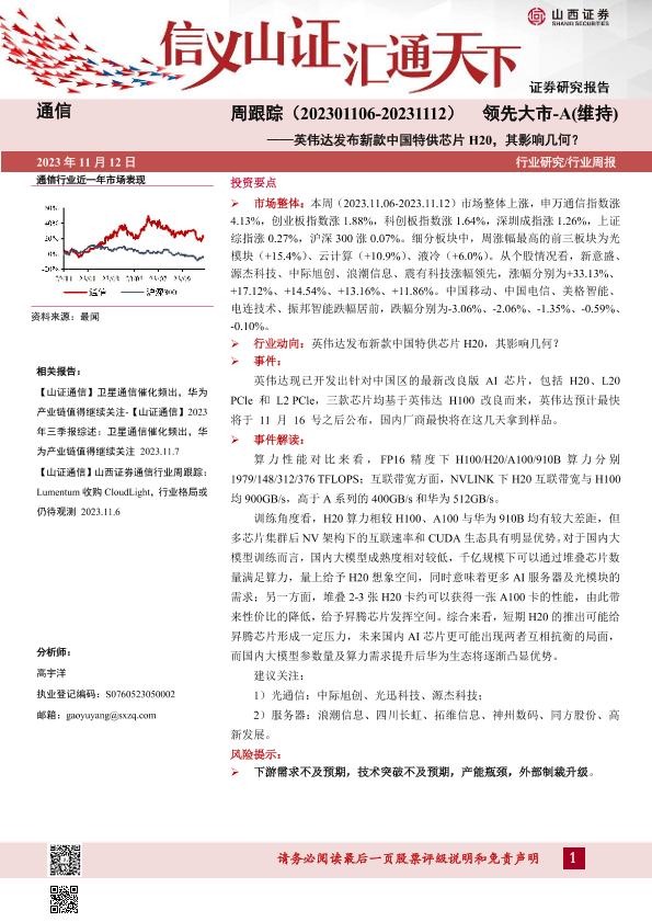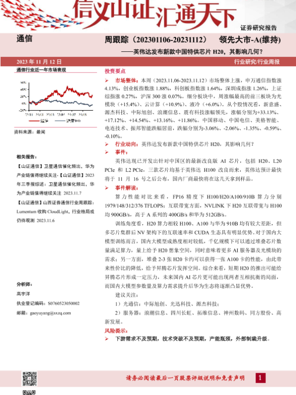 【山西证券】【20231112】20231112-山西证券-通信周跟踪:英伟达发布新款中国特供芯片H20,其影响几何?-12页