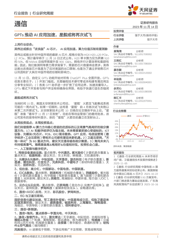 【天风证券】【20231114】20231114-天风证券-通信行业研究周报:GPTs推动AI应用加速,星舰或将再次试飞-11页