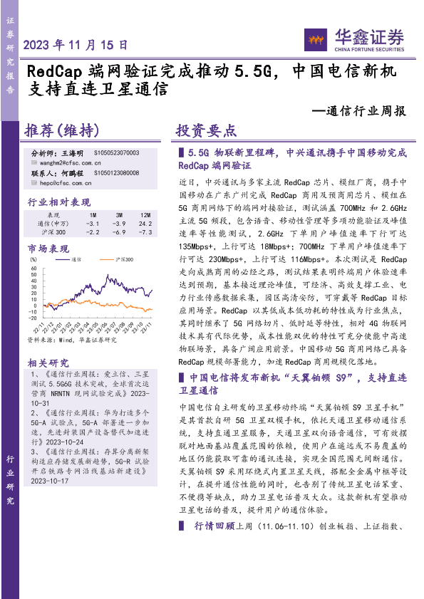 【华鑫证券】【20231115】通信行业周报:RedCap端网验证完成推动5.5G,中国电信新机支持直连卫星通信-22页