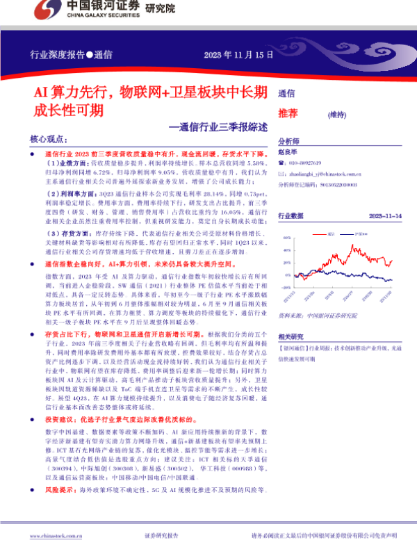 【银河证券】【20231115】20231115-中国银河-通信行业三季报综述:AI算力先行,物联网+卫星板块中长期成长性可期-24页