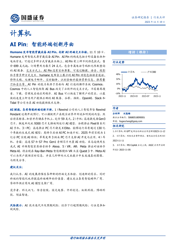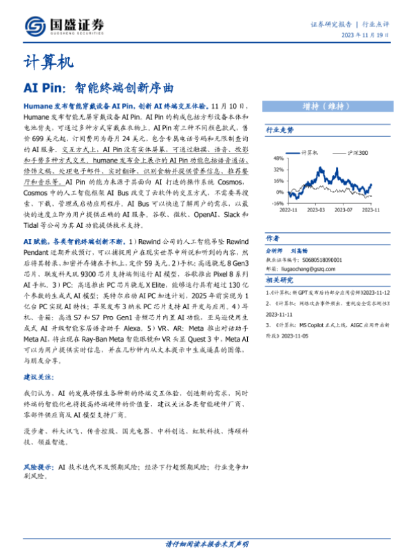 【国盛证券】【20231119】计算机:AI Pin:智能终端创新序曲-15页