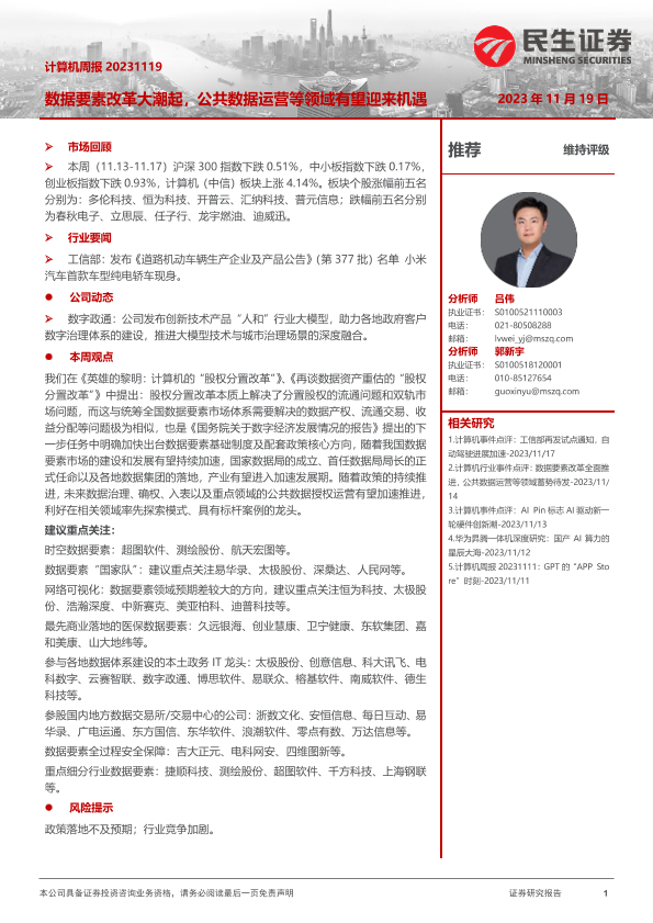 【民生证券】【20231119】20231119-民生证券-计算机周报:数据要素改革大潮起,公共数据运营等领域有望迎来机遇-24页