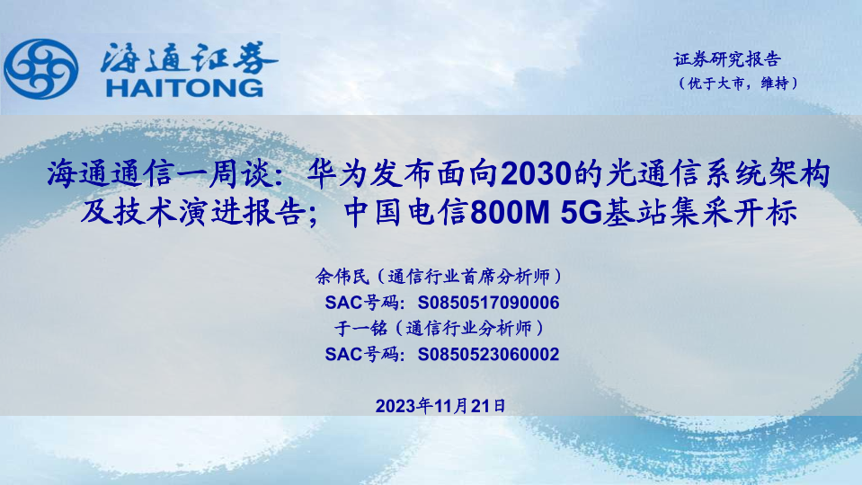 【海通证券】【20231121】海通通信一周谈:华为发布面向2030的光通信系统架构及技术演进报告;中国电信800M 5G基站集采开标-11页