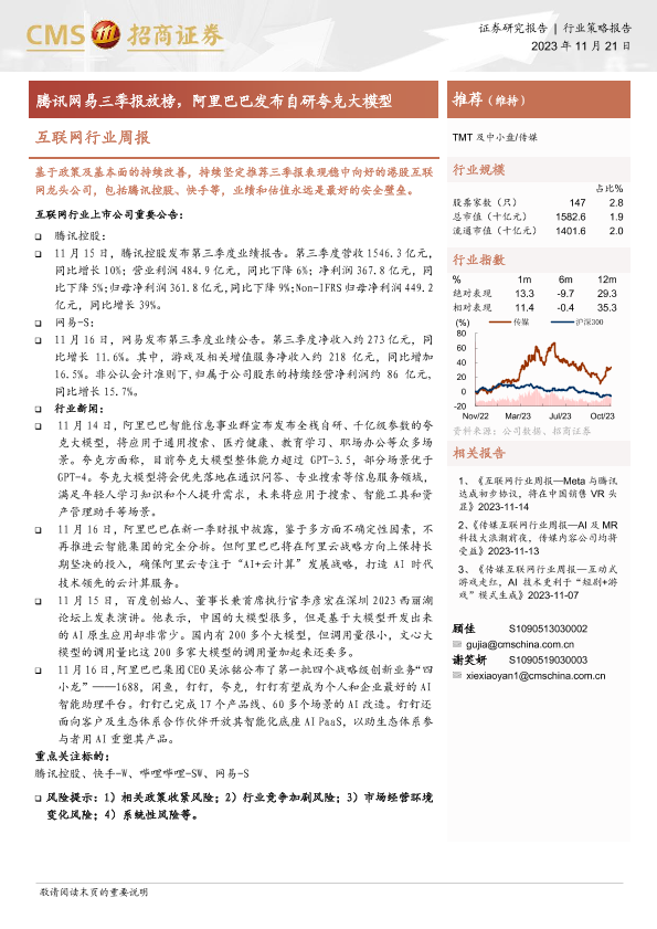【海通证券】【20231121】20231121-招商证券-互联网行业周报:腾讯网易三季报放榜,阿里巴巴发布自研夸克大模型-10页