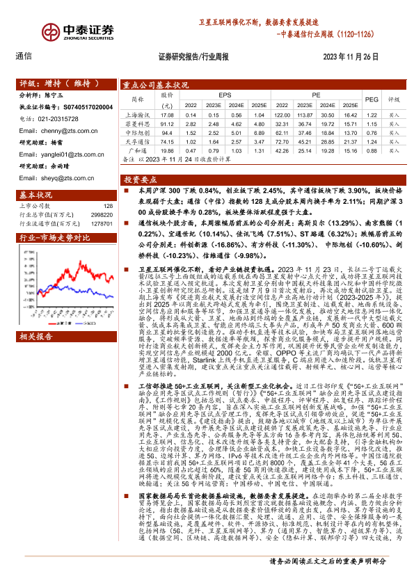 【中泰证券】【20231126】中泰通信行业周报:卫星互联网催化不断,数据要素发展提速-12页