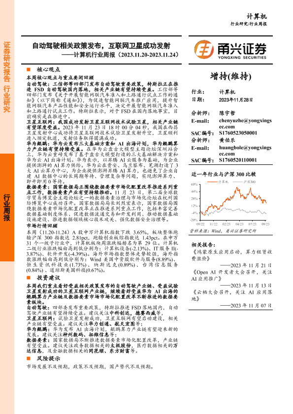 【甬兴证券】【20231128】20231128-甬兴证券-计算机行业周报:自动驾驶相关政策发布,互联网卫星成功发射-12页