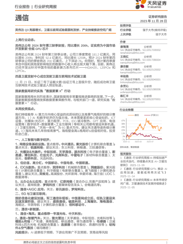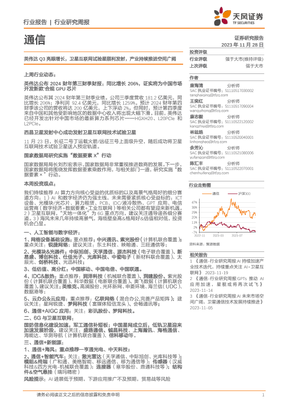 【天风证券】【20231128】20231128-天风证券-通信行业研究周报:英伟达Q3亮眼增长,卫星互联网试验星顺利发射,产业持续推进空间广阔-11页