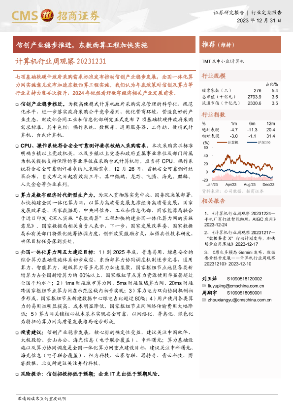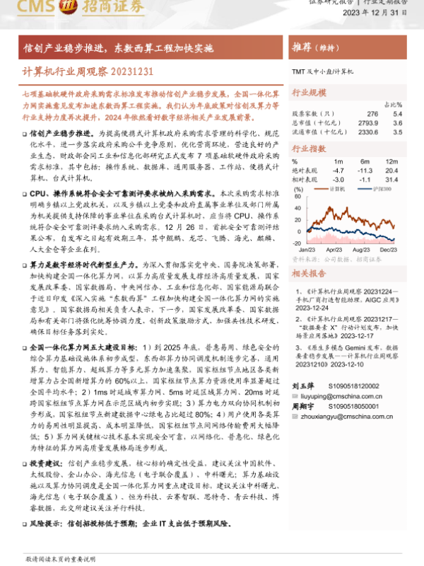 【海通证券】【20231231】计算机行业周观察:信创产业稳步推进,东数西算工程加快实施-10页
