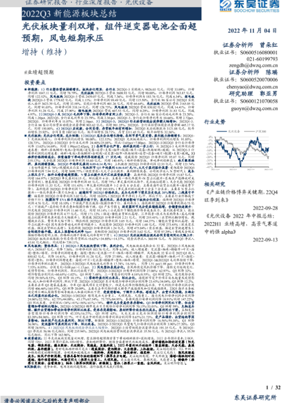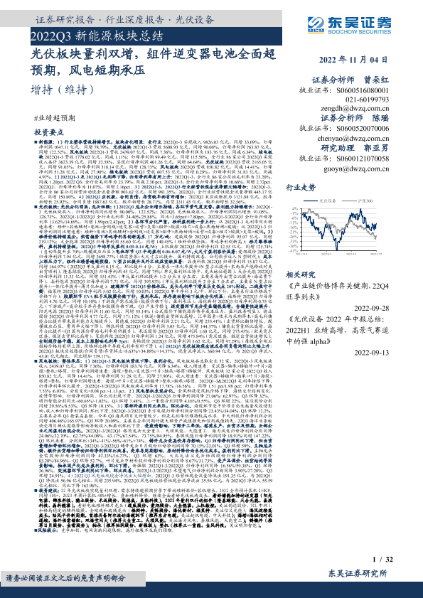 【东吴证券】【20221104】2022Q3新能源行业板块总结:光伏板块量利双增,组件逆变器电池全面超预期,风电短期承压-32页