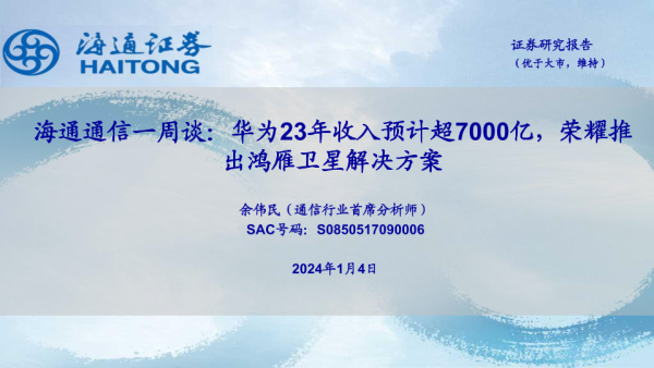 【海通证券】【20240104】海通通信一周谈:华为23年收入预计超7000亿,荣耀推出鸿雁卫星解决方案-11页