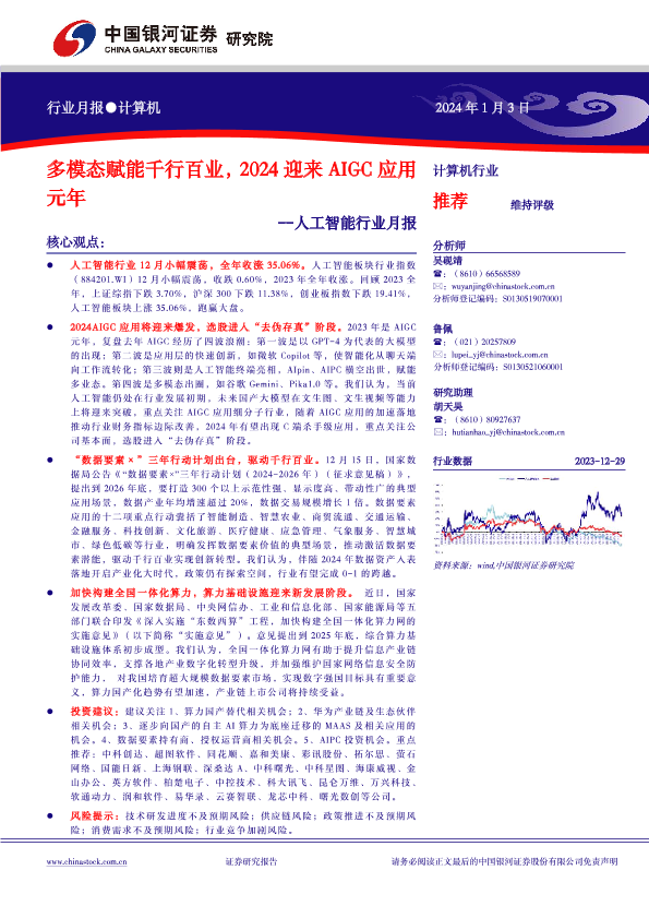 【银河证券】【20240103】20240103-中国银河-人工智能行业月报:多模态赋能千行百业,2024迎来AIGC应用元年-37页