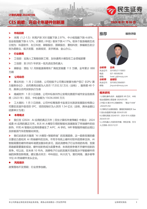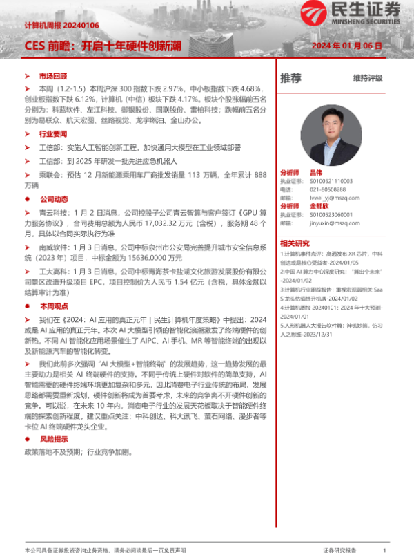 【民生证券】【20240106】20240106-民生证券-计算机周报:CES前瞻:开启十年硬件创新潮-19页