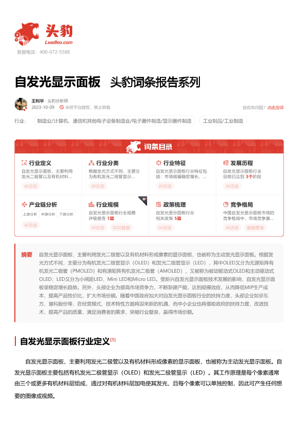 【头豹研究院】【20231009】20240112-头豹研究院-自发光显示面板 头豹词条报告系列-18页