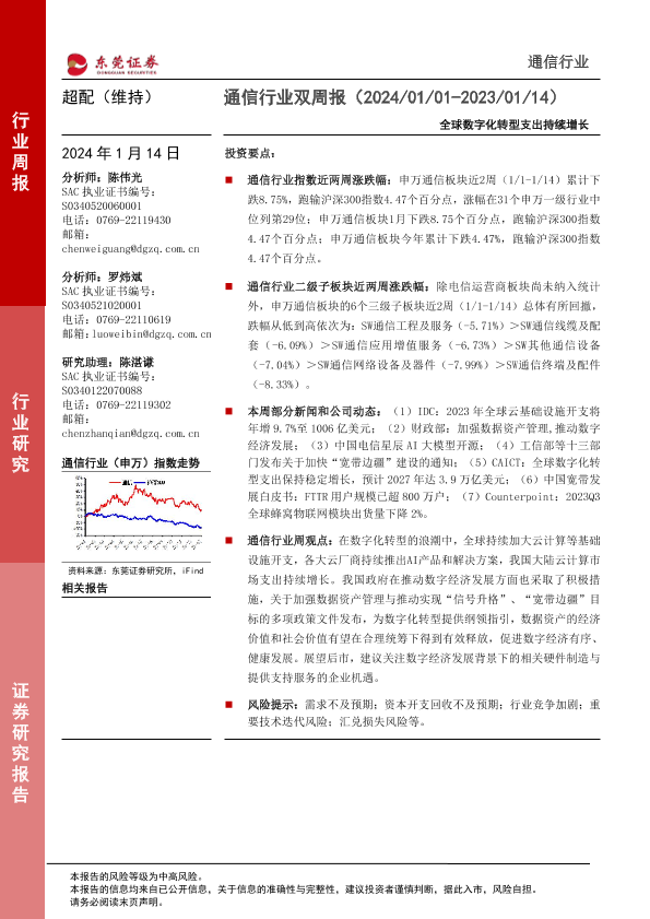 【东莞证券】【20240114】通信行业双周报:全球数字化转型支出持续增长-12页