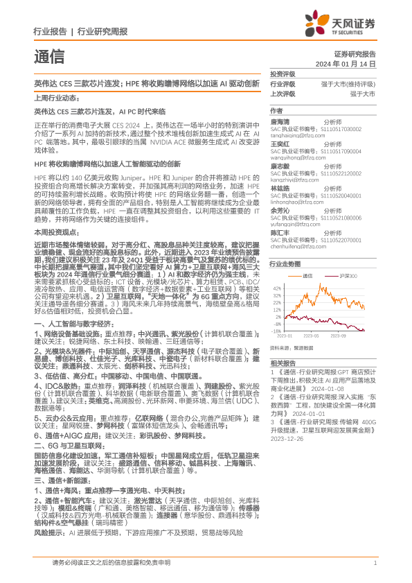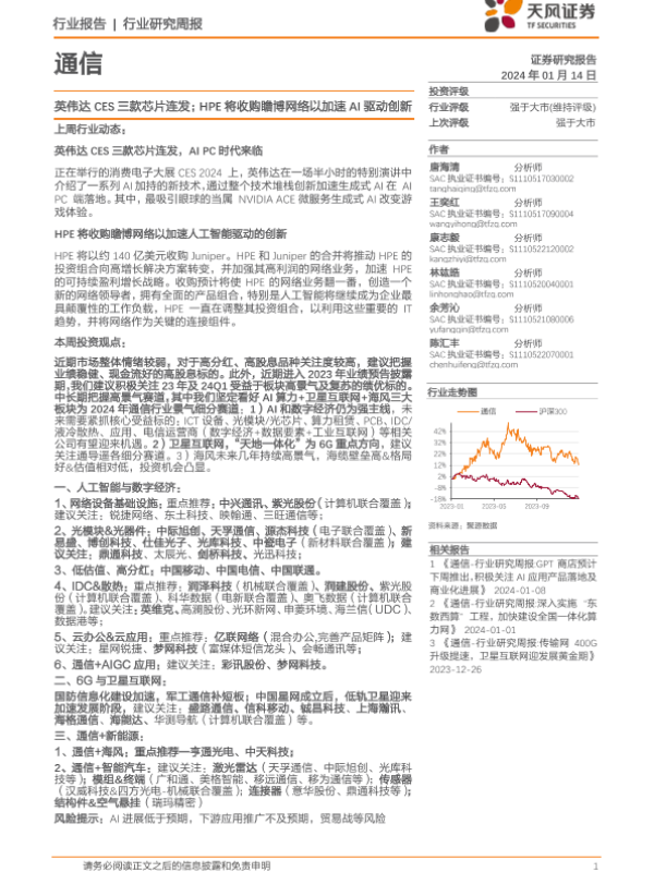 【天风证券】【20240114】通信行业研究周报:英伟达CES三款芯片连发;HPE将收购瞻博网络以加速AI驱动创新-12页