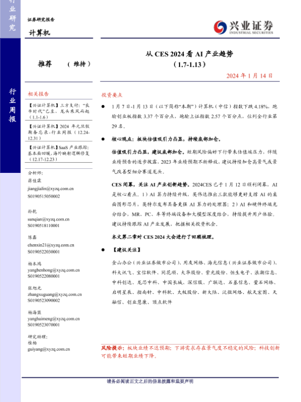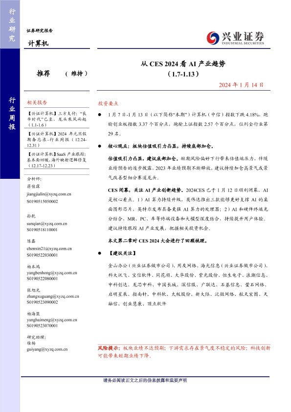 AI产业 技术创新 行业周报 计算机行业 CES