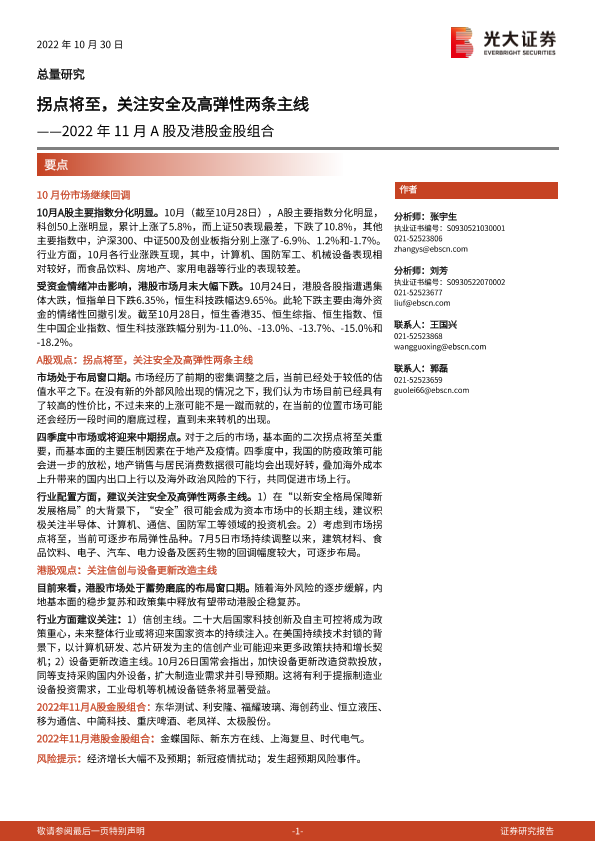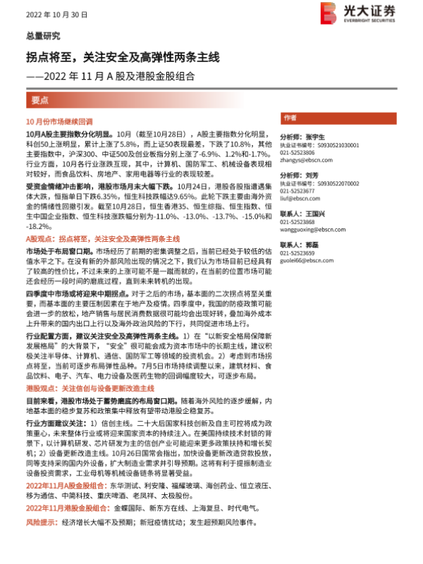 【光大证券】【20221030】2022年11月A股及港股金股组合:拐点将至,关注安全及高弹性两条主线-18页