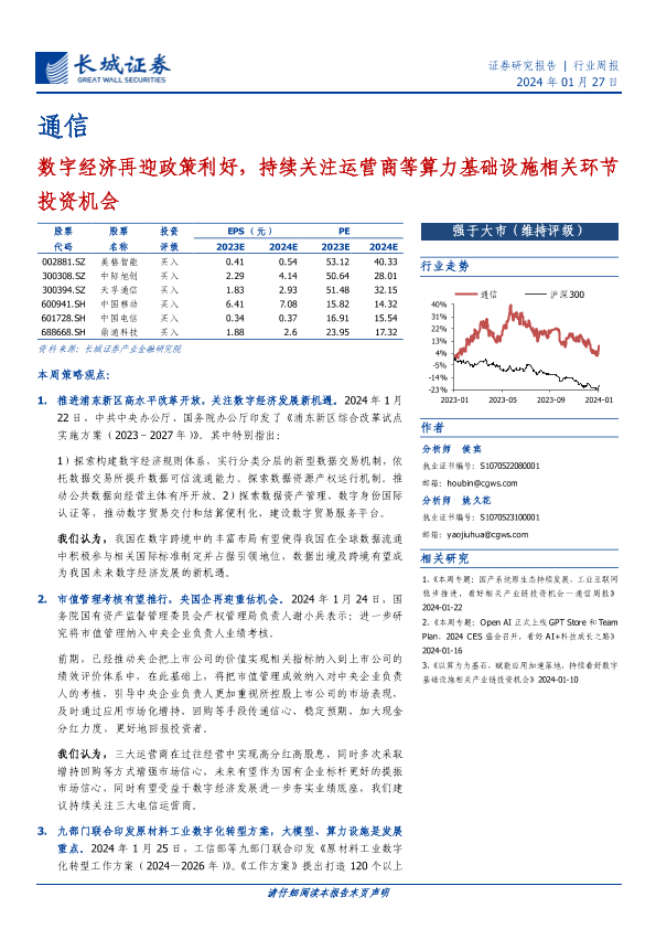 【长城证券】【20240127】通信行业周报:数字经济再迎政策利好,持续关注运营商等算力基础设施相关环节投资机会-16页