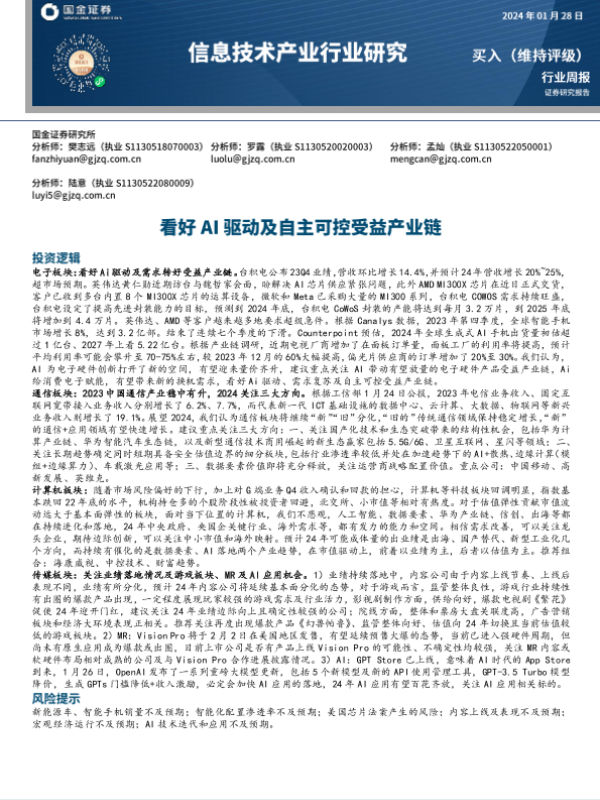 【国金证券】【20240128】信息技术产业行业研究:看好AI驱动及自主可控受益产业链-23页