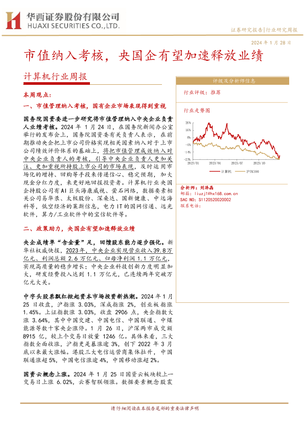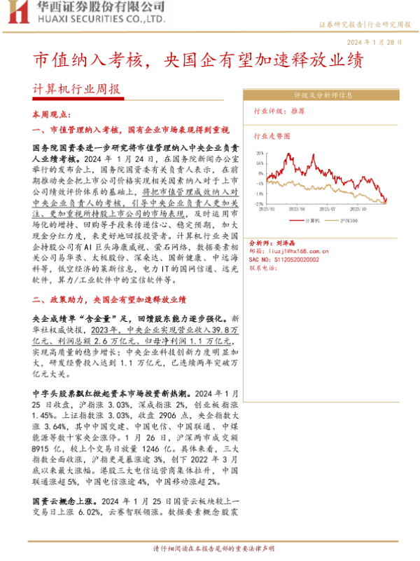 【华西证券】【20240128】20240128-华西证券-计算机行业周报:市值纳入考核,央国企有望加速释放业绩-32页