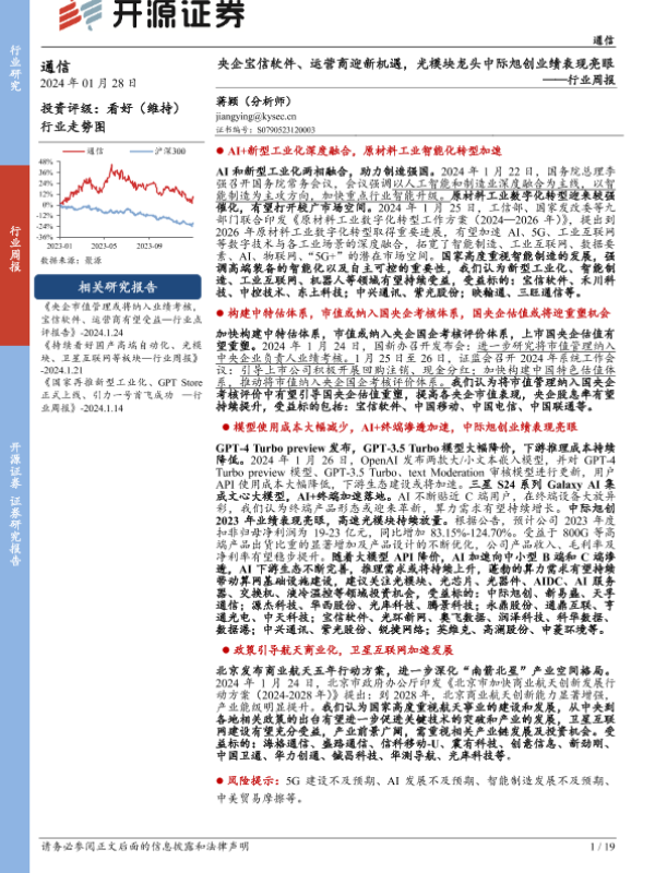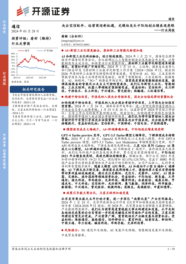 【开源证券】【20240128】20240128-开源证券-通信行业周报:央企宝信软件、运营商迎新机遇,光模块龙头中际旭创业绩表现亮眼-19页