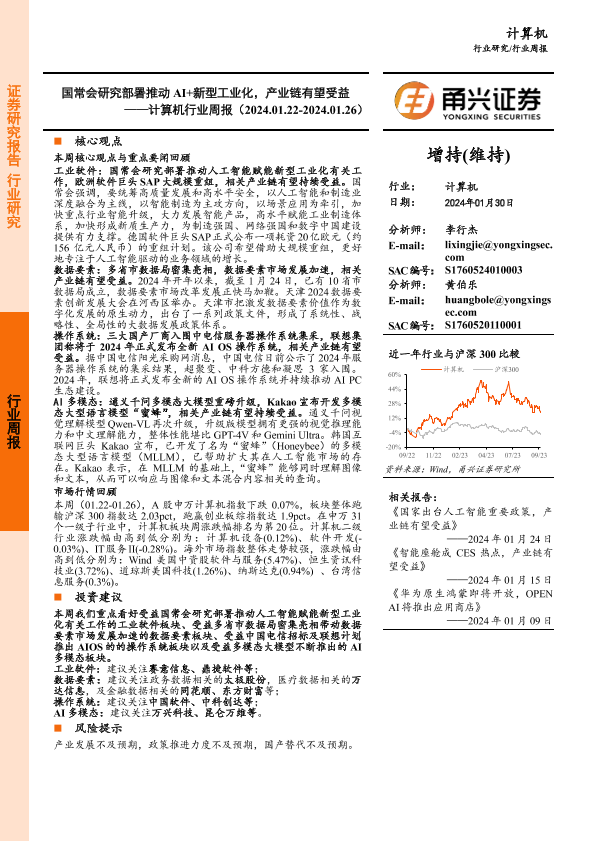【甬兴证券】【20240130】国常会研究部署推动AI+新型工业化,产业链有望受益——计算机行业周报(2024.01.22-2024.01.26)-15页