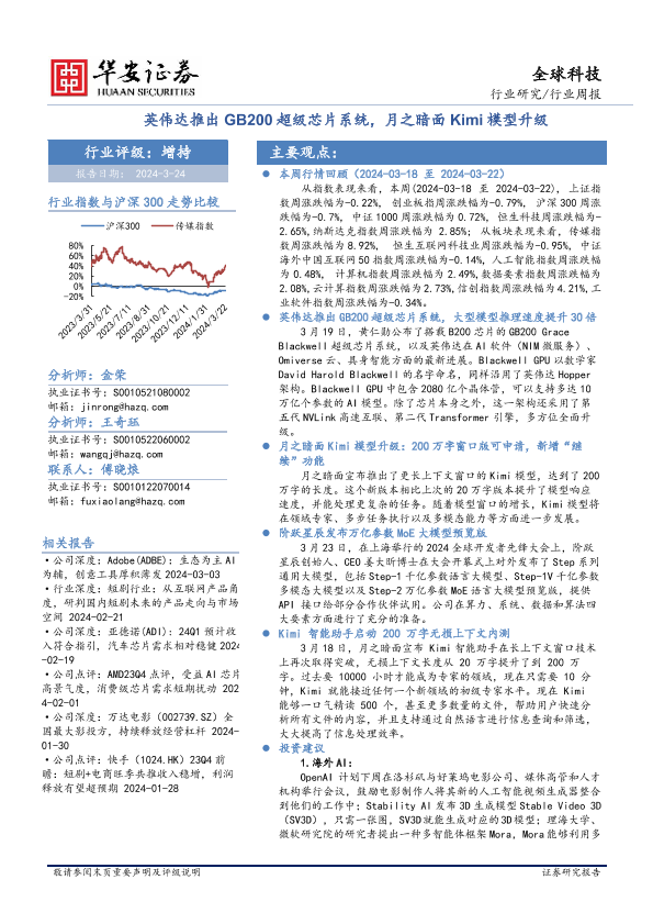 【华安证券】【20240324】全球科技行业周报:英伟达推出GB200超级芯片系统,月之暗面Kimi模型升级-24页
