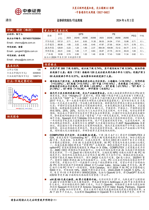 【中泰证券】【20240602】卫星互联网进展加速,关注端侧AI创新 - 中泰通信行业周报(0527-0602)-20页