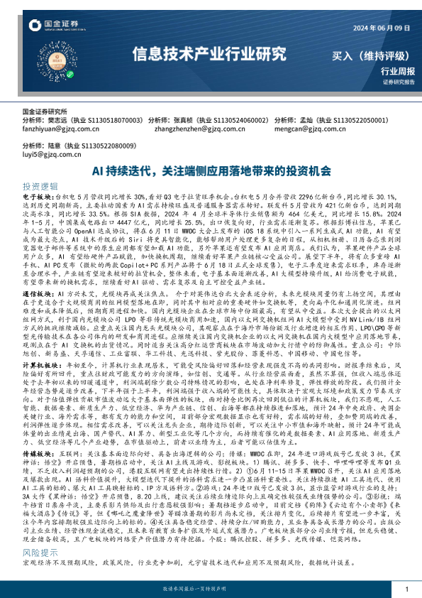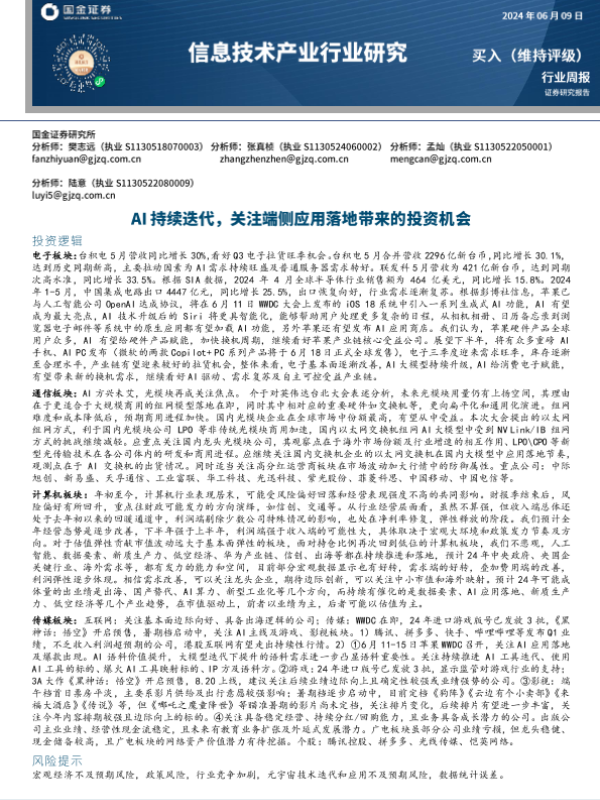 【国金证券】【20240609】信息技术产业行业研究:AI持续迭代,关注端侧应用落地带来的投资机会-20页