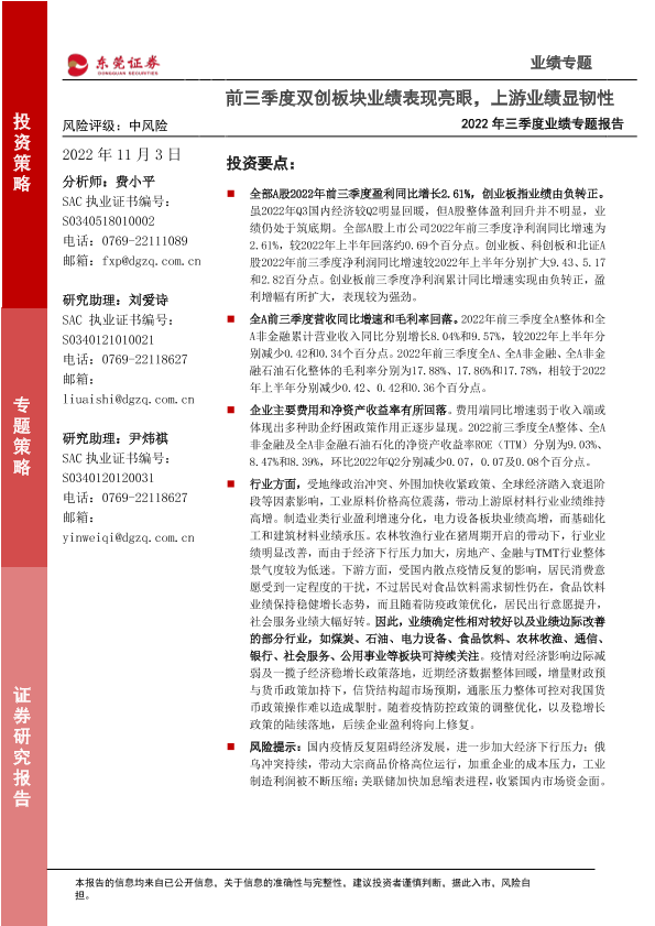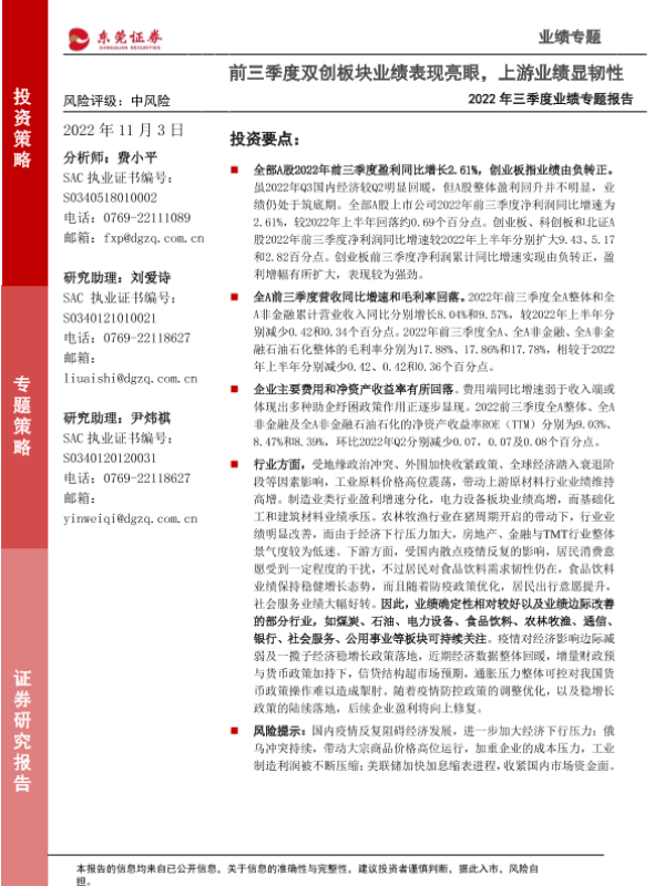【东莞证券】【20221103】2022年三季度业绩专题报告:前三季度双创板块业绩表现亮眼,上游业绩显韧性-20页