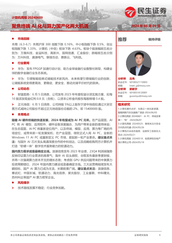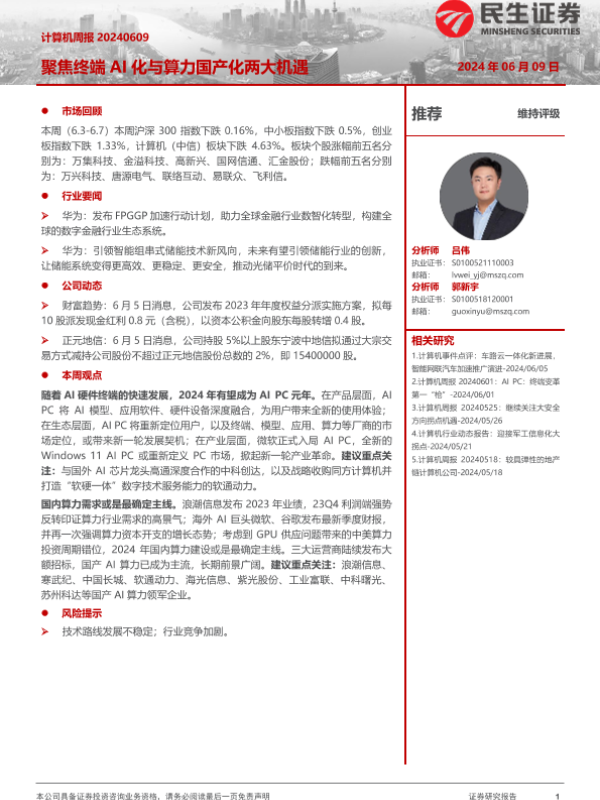 【民生证券】【20240609】计算机周报:聚焦终端AI化与算力国产化两大机遇-19页