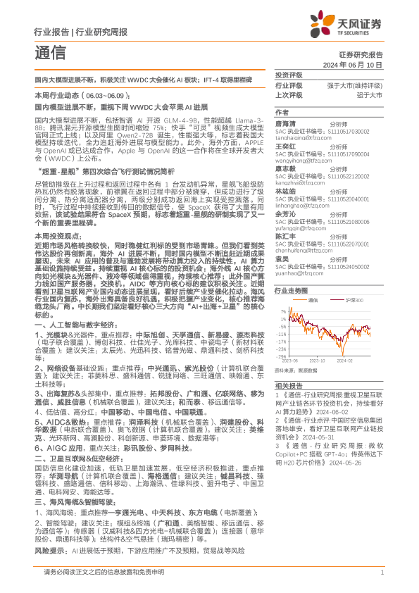 【天风证券】【20240610】20240610-天风证券-通信行业研究周报:国内大模型进展不断,积极关注WWDC大会催化AI板块;IFT-4取得里程碑-12页