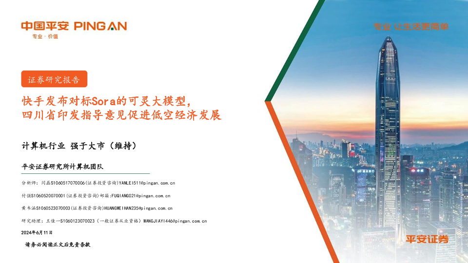 【平安证券】【20240611】20240611-平安证券-计算机行业周报:快手发布对标Sora的可灵大模型,四川省印发指导意见促进低空经济发展-10页