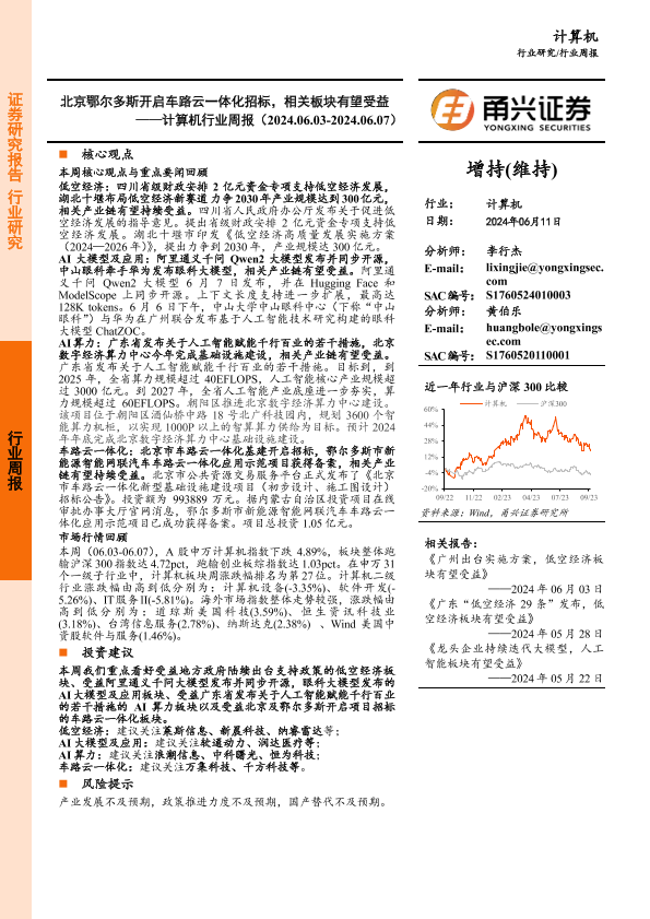 【甬兴证券】【20240611】20240611-甬兴证券-计算机行业周报:北京鄂尔多斯开启车路云一体化招标,相关板块有望受益-14页