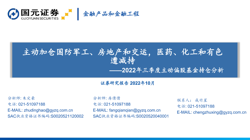 【国元证券】【20221031】2022年三季度主动偏股基金持仓分析:主动加仓国防军工、房地产和交运,医药、化工和有色遭减持-68页