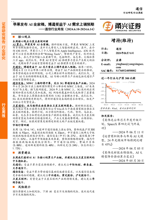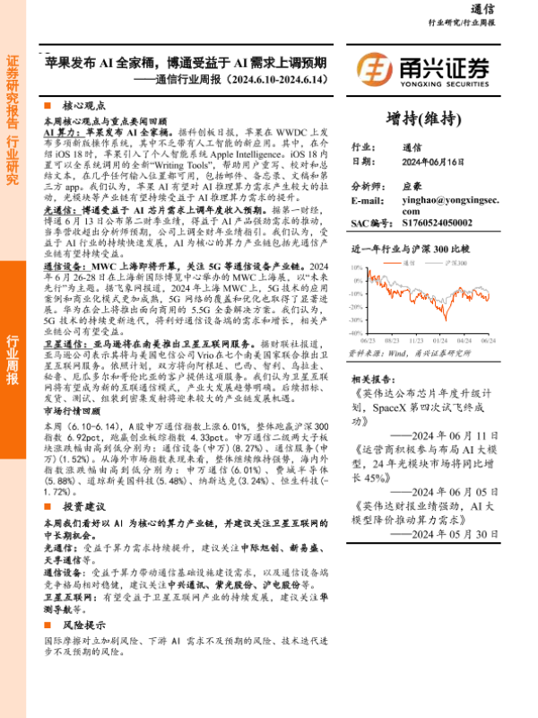 【甬兴证券】【20240616】20240616-甬兴证券-通信行业周报:苹果发布AI全家桶,博通受益于AI需求上调预期-14页