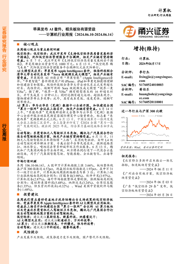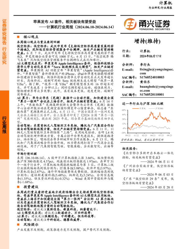【甬兴证券】【20240617】20240617-甬兴证券-计算机行业周报:苹果发布AI套件,相关板块有望受益-15页