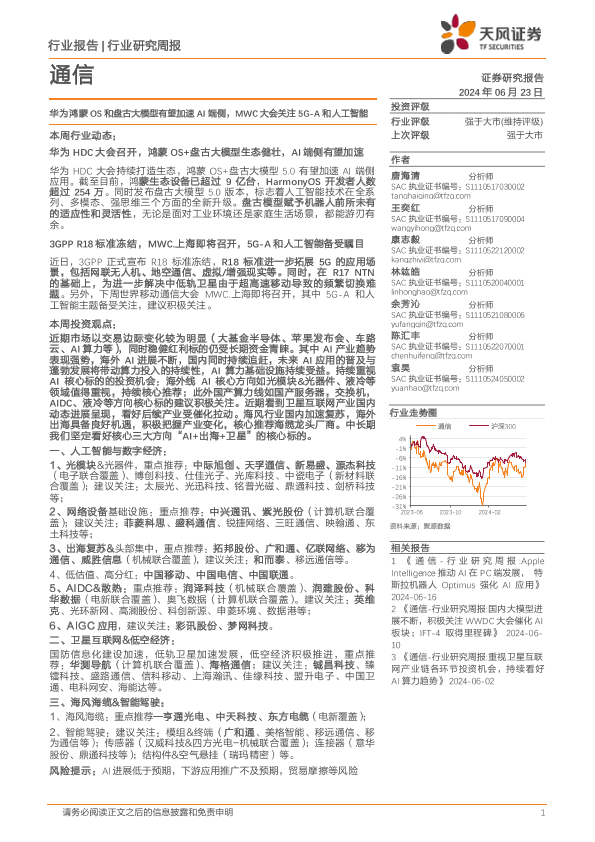 【天风证券】【20240623】20240623-天风证券-通信行业研究周报:华为鸿蒙OS和盘古大模型有望加速AI端侧,MWC大会关注5G-A和人工智能-10页