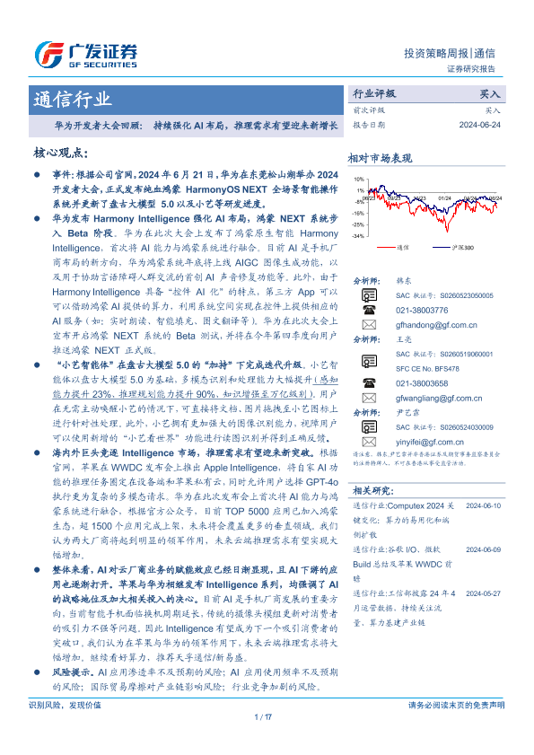 【广发证券】【20240624】20240624-广发证券-通信行业投资策略周报:华为开发者大会回顾:持续强化AI布局,推理需求有望迎来新增长-17页