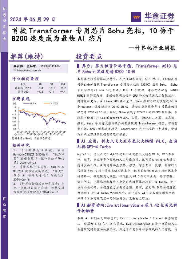 【华鑫证券】【20240629】20240629-华鑫证券-计算机行业周报:首款Transformer专用芯片Sohu亮相,10倍于B200速度成为最快AI芯片-16页