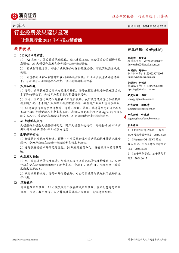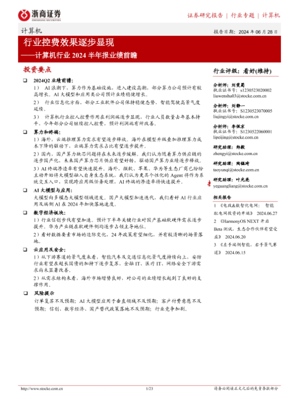 【浙商证券】【20240628】计算机行业2024半年报业绩前瞻:行业控费效果逐步显现-23页